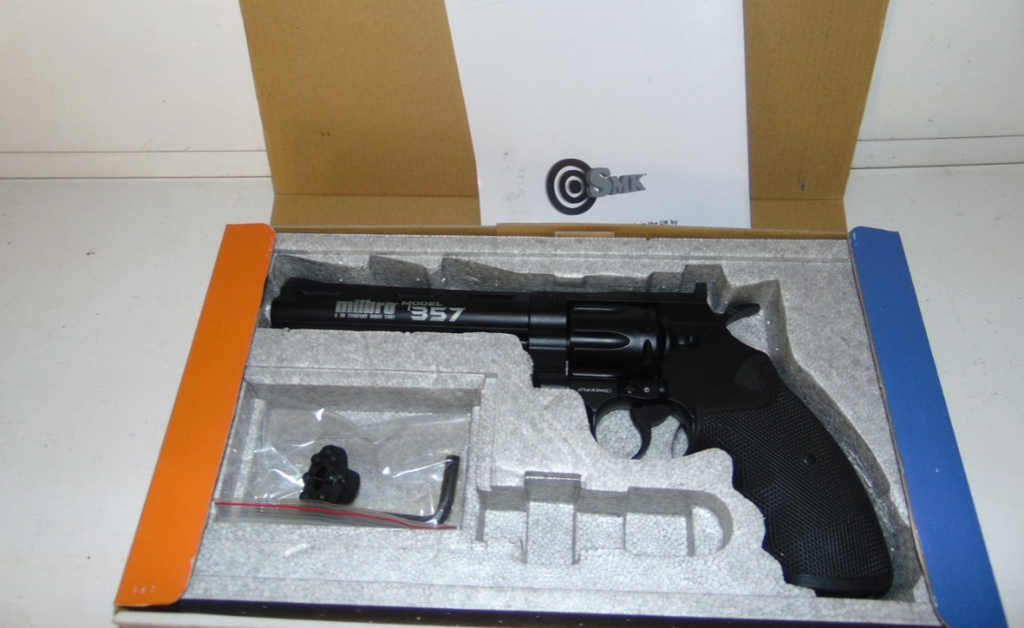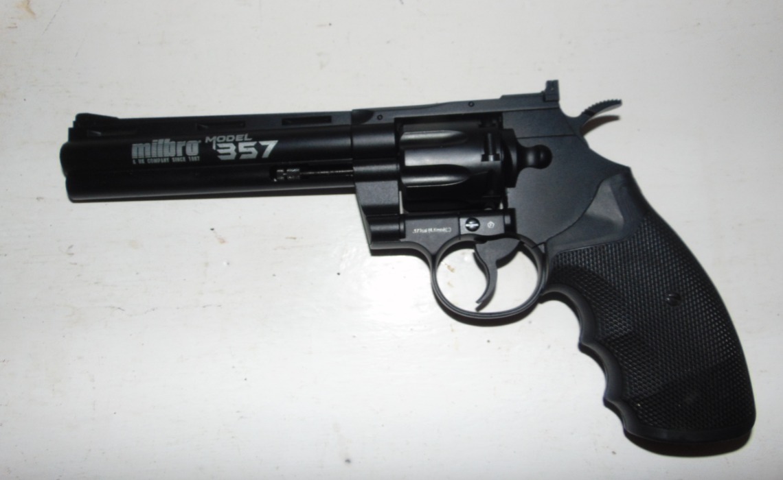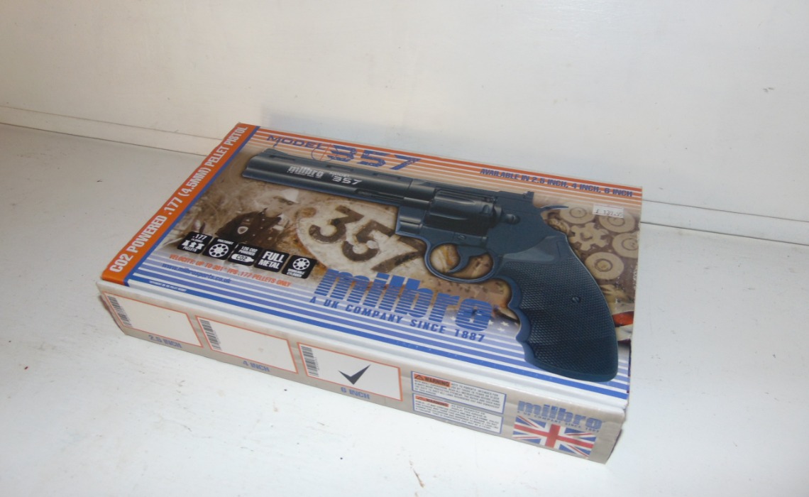 NEW Milbro Model 357 is a CO2 powered .177 BB revolver air pistol. No license required but must be over 18. Stock No. C251