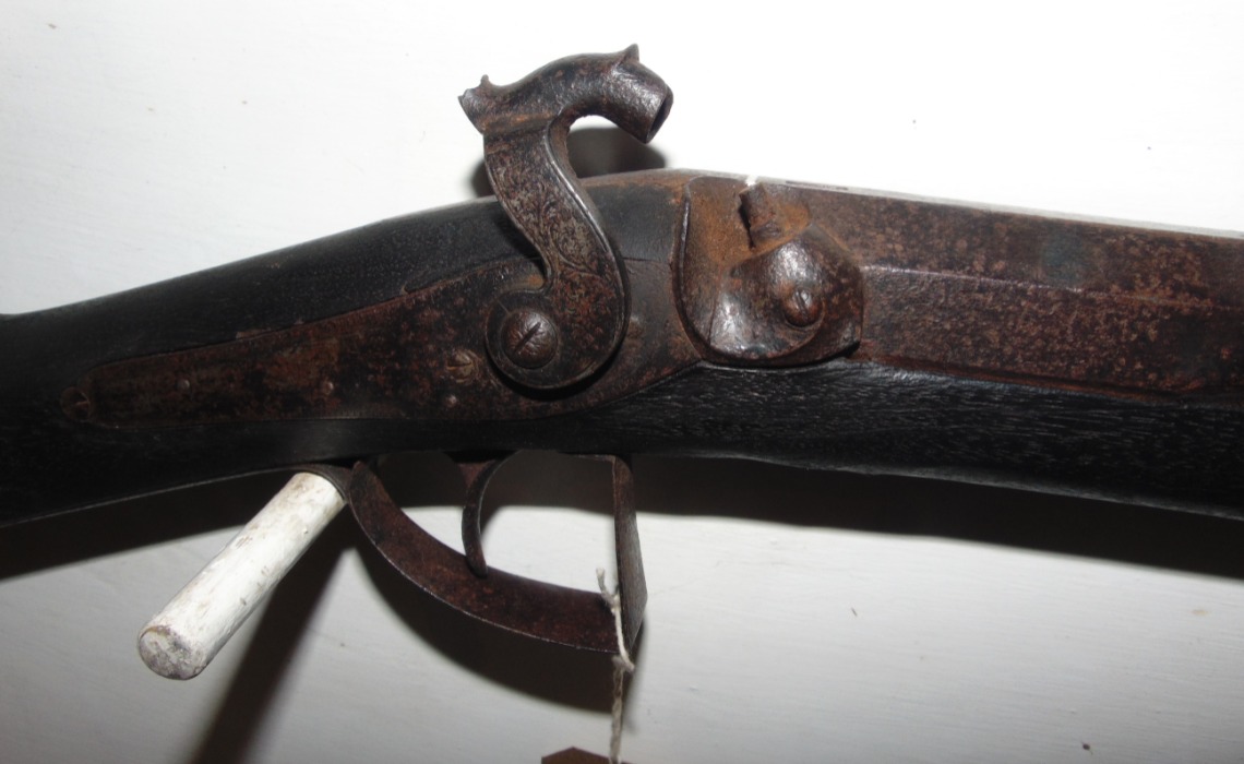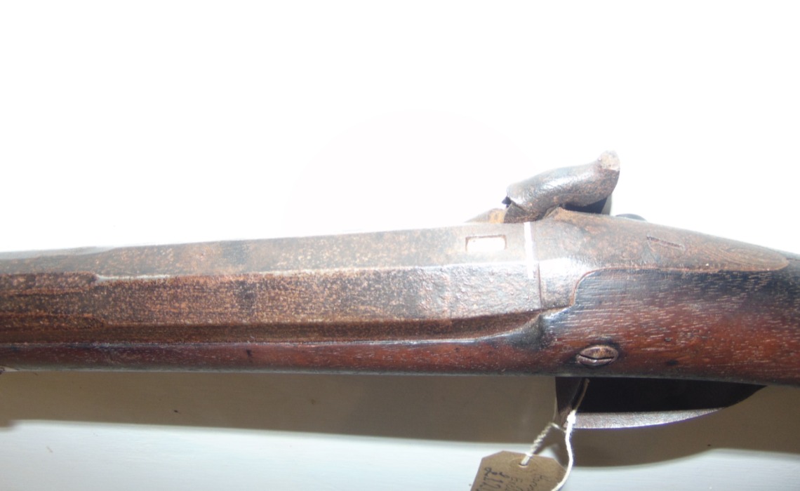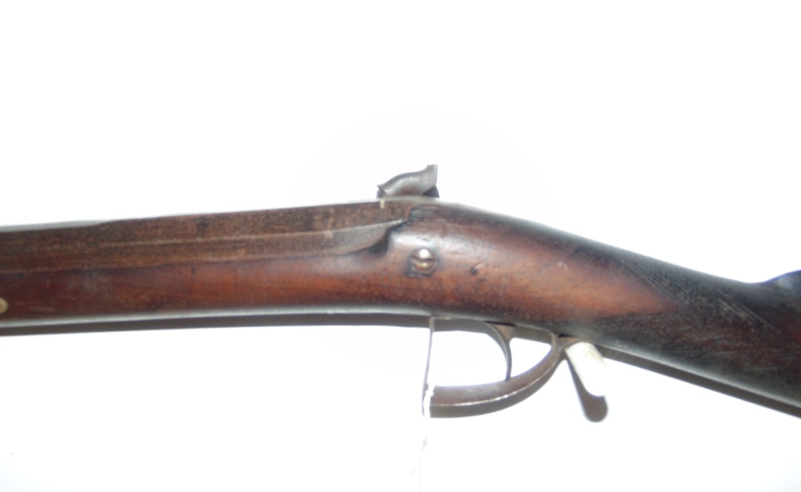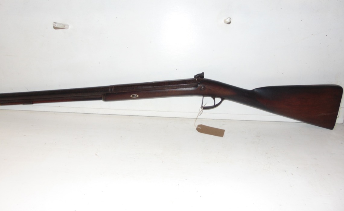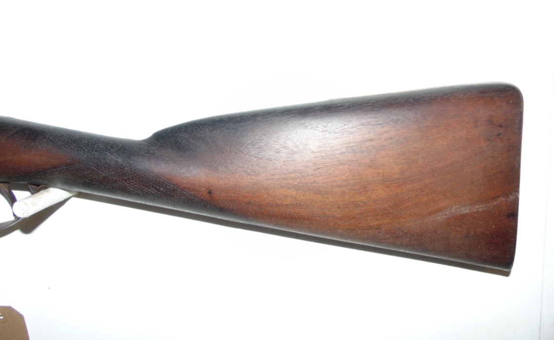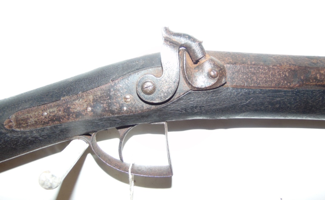 Harvey and son of Exeter single barrel percussion gun, in as found condition, has light fire damage (see photo's) hammer spur missing and rod damaged, would make interesting wall hanger as is or easy restoration project. No licence required but must be over 18.