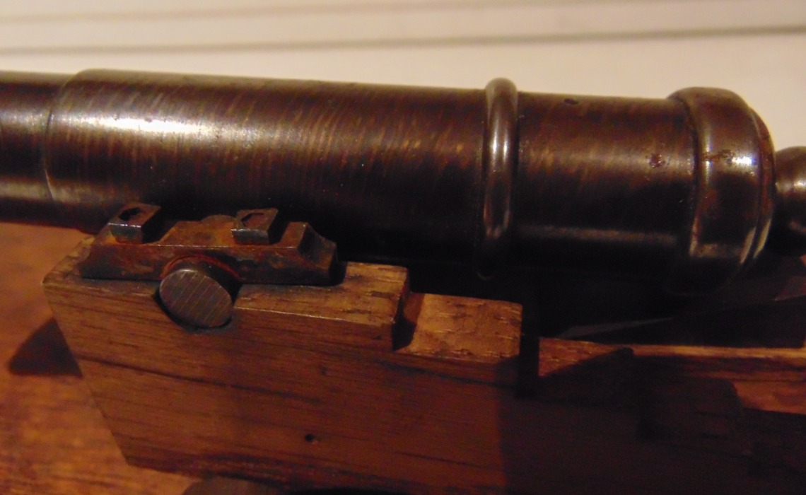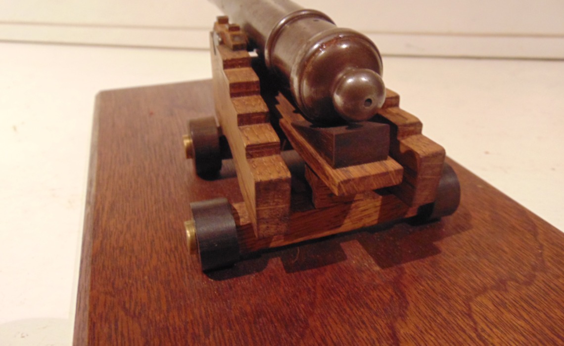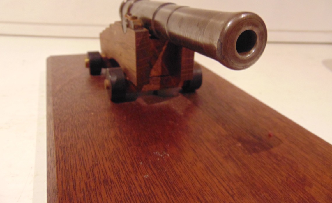 A very nice non firing model cannon, wood and steel, barrel showing Damascus patterning, mounted on wooden board, board measures 6' X 10' cannon 6 3/8' in lengh and approximately 7/8' diameter at muzzle, in excellent condition.